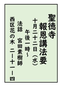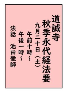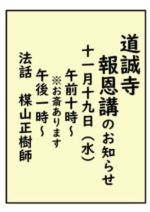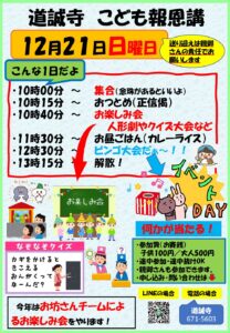 道誠寺 こども報恩講 12月21日(日) 10時 集合 10時15分 おつとめ(正信偈) 10時40分 お楽しみ会(クイズや人形劇) 11時30分 お昼ご飯(カレーライス) 12時30分 ビンゴ大会 参加費(お賽銭) こ […]
