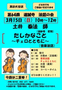 第64回 2月 チラシ 道誠寺 法話の会 3月15日(日) 10時より 今回は熱田区法妙寺の土井さんにチェロによる音楽法話です。 2年ぶりにお越しいただきます。 ぜひ、お参りください。 しかも、今回は二重奏です。